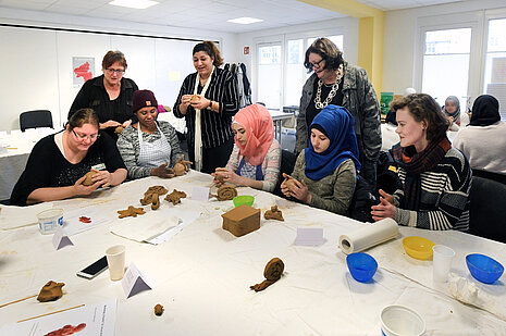 Buntes Stimmengewirr empfängt die Besucherinnen beim Eintritt in den offenen Raum, der vom Mehrgenerationenhaus Speyer zur Verfügung gestellt wird. Zum Trommelrhythmus im Hintergrund bearbeiten 17 Frauen ungeformten Ton. Nach einer Zeit wird es stiller, denn jede ist nun konzentriert auf ihr Werk. Der Workshop "Frau-Sein" ist Teil des Projektes "Sexualaufklärung und Familienplanung im interkulturellen Kontext" unter der Trägerschaft des Diakonischen Werks Pfalz. Gefördert wird es von der Bundeszentrale für gesundheitliche Aufklärung und dem Familienministerium. Geleitet und begleitet wird es von der Referentin Eva-Maria Wecker. Ziel des Projektes ist es, Frauen zusammenzubringen, um ihnen die Gelegenheit zu bieten, sich mit Ihrem Selbstbild als Frau aus einer anderen Perspektive künstlerisch auseinanderzusetzen - sei es, um sich selbst zu vergewissern oder aber neue Horizonte zu erfahren und Grenzen zu überwinden.