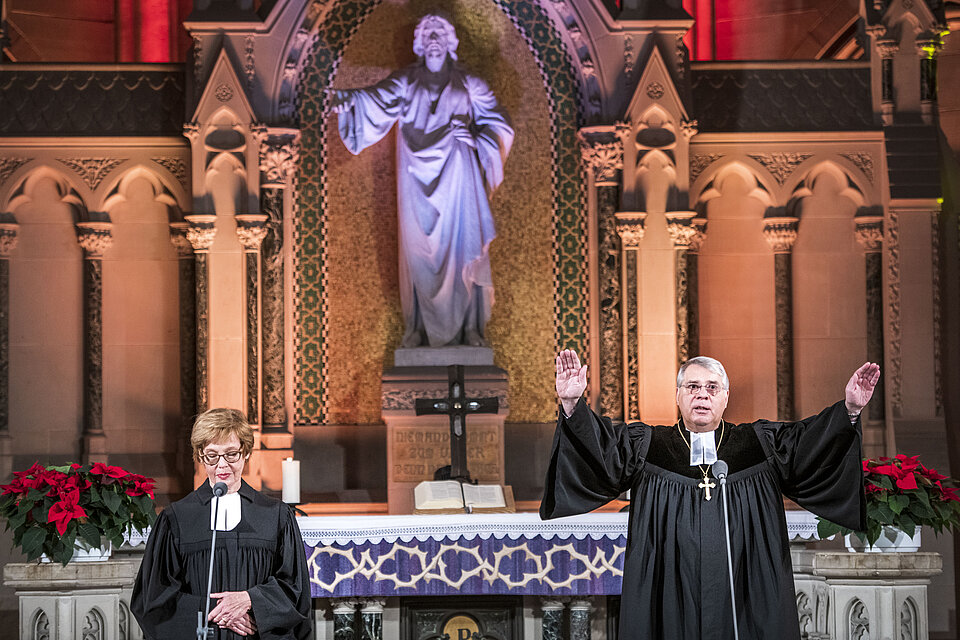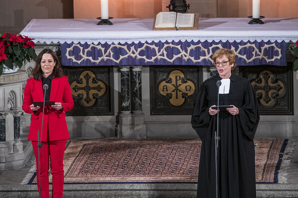 Die Präsidentin von Brot für die Welt, Cornelia Füllkrug-Weitzel, lenkte den Blick im Fürbittengebet auf alle, die jetzt besonderen Schutz brauchen. Sie sagte: „Anderen Zukunft schenken, das heißt: weitergeben, was wir selbst empfangen haben.“