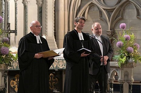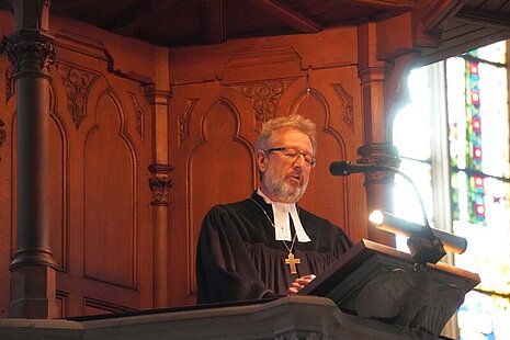 Glaube, Liebe, und Hoffnung: Mit diesem Dreiklang versammle Gott alle, die auf sein Wort hören, sagte Oberkirchenrat Manfred Sutter in seiner Predigt. Gerade in diesen Tagen werde deutlich, wie wichtig die Hoffnung als vermittelnder Klang zwischen dem Oberton der Liebe und dem Grundton des Glaubens sei. In Zeiten von Pandemie, Pflegenotstand und nun auch Krieg in Europa benötigten die Menschen eine Hoffnung, die sich nicht mit den gegebenen Umständen zufriedengebe, sondern mutig gegen diese ankämpfe. Sutter hob besonders die Arbeit der georgischen Diakonie hervor, die eben diese Hoffnung in den Menschen wecke.