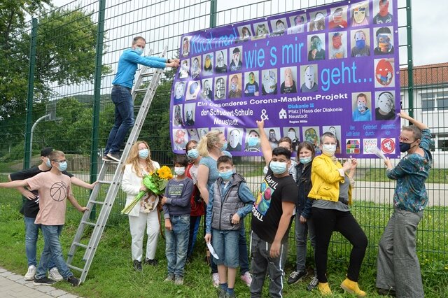 Nach Abschluss des Projektes ziert nun ein Banner mit dem Titel „Kuck mal, wie‘s mir geht….“ und Fotos der entstandenen Masken den Schulzaun an der Wallgasse.