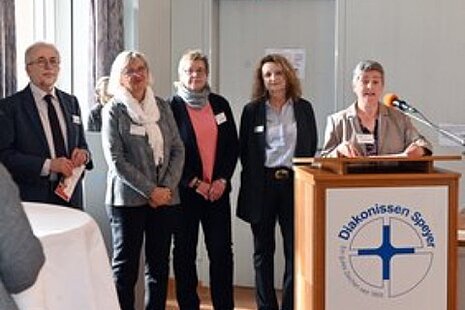 Auf dem zweiten Bild von oben sind zu sehen: Dr. Günter Geisthardt, Evangelische Diakonissenanstalt Speyer-Mannheim-Bad Dürkheim, Maria Knapp, Mitarbeiterin der Schwangerenberatungsstelle des DWP in Speyer, Katrin Lepke, Vorstandsmitglied des FASD (Fetal Alcohol Spectrum Disorder) Deutschland e.V.; Iris Löhr, Suchtpräventionsfachfrau von NIDRO Speyer sowie am Redepult Anette Schilling, leitende Referentin für Suchtkrankenhilfe im Diakonischen Werk Pfalz.