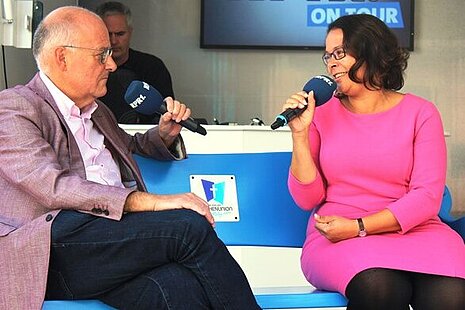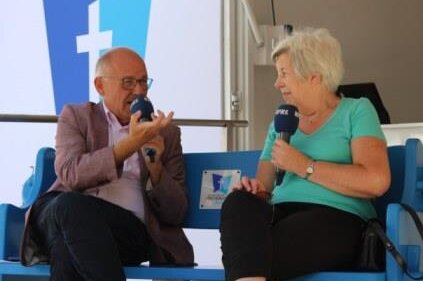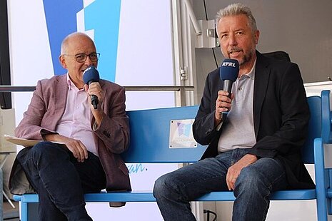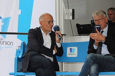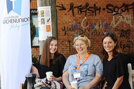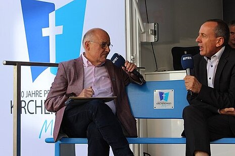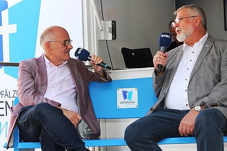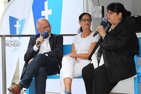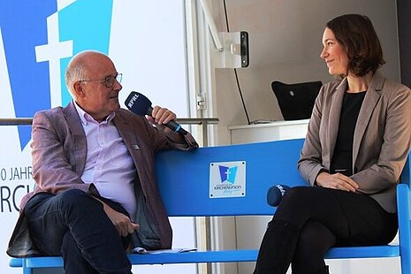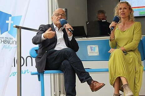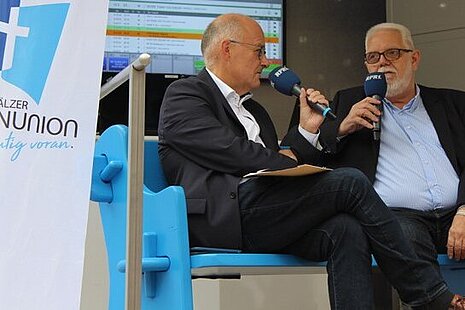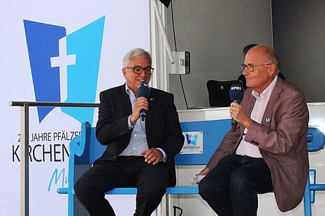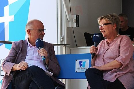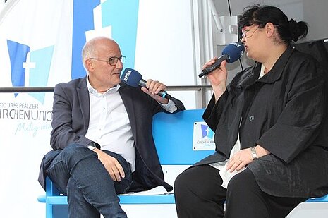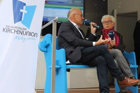Auf der Radio-Bühne lud Diakoniepfarrer Albrecht Bähr auf der blauen Bank der Diakonie zum Gespräch ein. Wie sie mutig voranschreiten, wie schwierig das auch sein kann, aber auch wie nötig, fragte er Mechthild Werner, Reinhard Oelbermann, den kirchenpolitischen Sprecher der CDU-Landtagsfraktion, den Kaiserslauterer Oberbürgermeister Klaus Weichel, Erika Christmann von "Frauen wagen Frieden", den Staatssekretär des Bildungsministeriums, Hans Beckmann, sowie Vertreterinnen der Ökumenischen Sozialstation. Am Samstag nahmen Wissenschaftsminister Konrad Wolf, Pfarrer Rudolf Ehrmantraut, der Hauptgeschäftsführer des Landesverbandes der Unternehmer, Werner Simon, die Landtagsabgeordnete und kirchenpolitische Sprecherin der SPD, Giorgina Kazungu-Haß, Innenminister Roger Lewentz, Felicity Harris von der Partnerkirche der URC, Kirchenpräsident Christian Schad, Integrationsministerin Anne Spiegel, Dekanin Dorothee Wüst, Synodalpräsident Hermann Lorenz, Oberkirchenrat Manfred Sutter und der Historiker Roland Paul Platz.