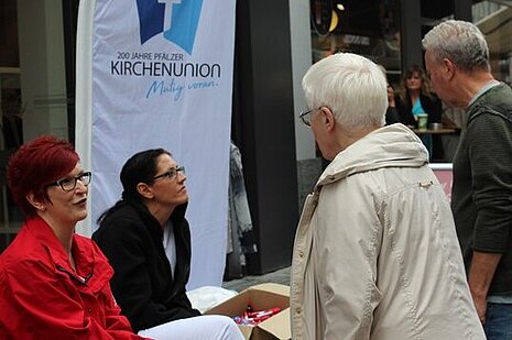 Kaiserslautern. Mal nicht unterm Kirchendach, sondern unter freiem Himmel auf der Kirchenbank Platz nehmen und über Gott und die Welt ins Gespräch kommen - diese Gelegenheit wollten sich die Besucher des Kirchenvolksfestes anlässlich des Jubiläums "200 Jahre Pfälzer Kirchenunion" in Kaiserslautern am Festwochenende 7. und 8. September 2018 nicht entgehen lassen. Gemeinden, kirchliche Werke und Einrichtungen haben auf der Unionsmeile von der Stiftskirche bis zur Unionskirche rund 40 Kirchenbänke mit dem markanten Unionslogo aufgebaut und die Passanten zum Plaudern und Informieren, Debattieren und Nachdenken eingeladen.