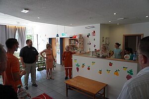 Bei einer dreistündigen Führung über das ehemalige Kasernengelände zeigte der Einrichtungsleiter Martin Ziemer der Gruppe die verschiedenen Einrichtungen auf dem ehemaligen Kasernengelände in Kusel. Aktuell werden in fünf Häusern ca. 550 Personen in der Erstaufnahmeeinrichtung betreut. 16 Hektar Fläche hat das Areal. Die AfA könne beinahe als eine kleine Kommune verstanden werden. Dabei sei die Infrastruktur der ehemaligen Kaserne bestmöglich genutzt worden. Den Flüchtlingen stehe eine medizinische Erstversorgung, eine Betreuung für Kinder, zwei Schulklassen und vieles weitere zur Verfügung. Im dem 2014 errichteten Verwaltungsgebäude befinden sich auch die Beratungsstelen von Diakonie und Caritas sowie eine Außenstelle des Psychosozialen Zentrums in Kaiserslautern, das durch das Deutsche Rote Kreuz betrieben wird. Der soziale Dienst wird durch das Privatunternehmen OSR gestellt.